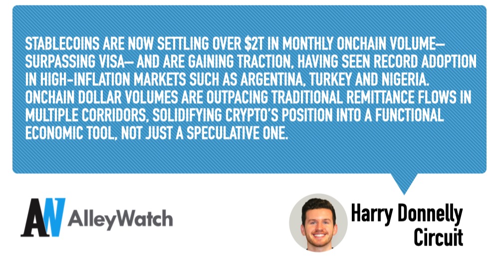 Stablecoins are now settling over $2T in monthly onchain volume– surpassing Visa– and are gaining traction, having seen record adoption in high-inflation markets such as Argentina, Turkey and Nigeria. Onchain dollar volumes are outpacing traditional remittance flows in multiple corridors, solidifying crypto’s position into a functional economic tool, not just a speculative one.