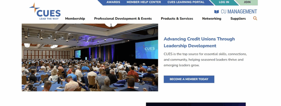Since 1962, CUES has been a leading international credit union executive membership association that targets leadership training, strategic education and talent development for credit union professionals. The enterprise stands apart for its concentrated hybrid learning solutions, which combine live events, online courses and peer-to-peer networking. Its exclusive executive education partners with top business schools, including Cornell and Wharton.